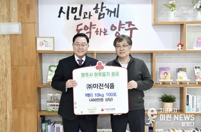 이런뉴스(e-runnews) 김삼성 기자 | 양주시는 최근 ㈜미진식품로부터 이웃돕기 성품으로 백미 10kg 100포(400만 원 상당)를 기탁받았다고 밝혔다.