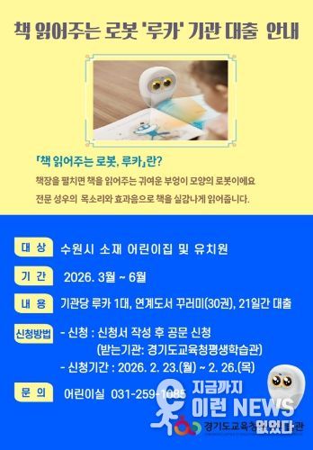 이런뉴스(e-runnews) 김삼성 기자 | 경기도교육청평생학습관이 수원시 소재 어린이집과 유치원을 대상으로 책 읽어주는 로봇 ‘루카(Luka)’와 ‘연계도서 꾸러미’ 대출 서비스를 운영한다.