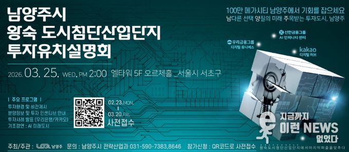 이런뉴스(e-runnews) 김삼성 기자 | 남양주시는 오는 3월 25일 서울 서초구 엘타워 오르체홀에서 ‘남양주시 왕숙 도시첨단산업단지 투자유치설명회’를 개최하며, 이에 앞서 3월 20일까지 참여 희망 기업을 대상으로 사전접수를 진행한다고 밝혔다.