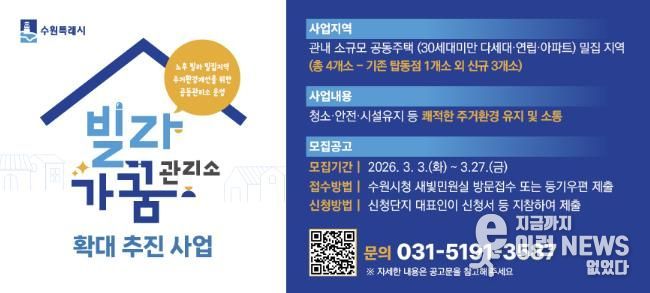 이런뉴스(e-runnews) 김삼성 기자 | 수원특례시는 노후 빌라 밀집지역을 체계적으로 관리하고, 주거환경을 개선하는 ‘2026년 빌라가꿈관리소 확대 추진사업’의 대상지 신청을 3월 27일까지 받는다.