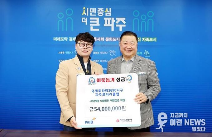 이런뉴스(e-runnews) 김삼성 기자 | 파주시는 23일 ‘국제로타리 3690지구 파주로타리클럽’으로부터 60세 이상 취약계층을 위한 5,400만 원 상당의 대상포진 사백신을 지원받았다고 밝혔다.