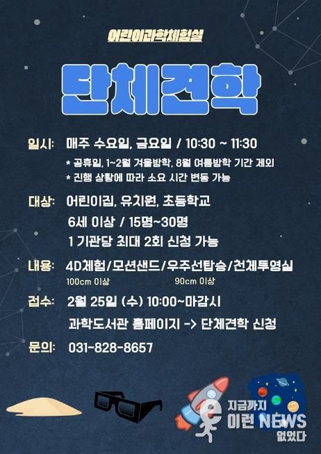 이런뉴스(e-runnews) 김삼성 기자 | 의정부과학도서관은 어린이집, 유치원 및 초등학교를 대상으로 3월부터 어린이과학체험실 단체 견학 프로그램을 운영한다.