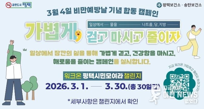 이런뉴스(e-runnews) 김삼성 기자 | 평택시는 오는 3월 4일 ‘비만 예방의 날’을 맞아, 3월 한 달간 시민과 함께하는 ‘가볍게 걷고, 마시고 줄이자’ 합동 캠페인을 대대적으로 전개한다고 밝혔다.