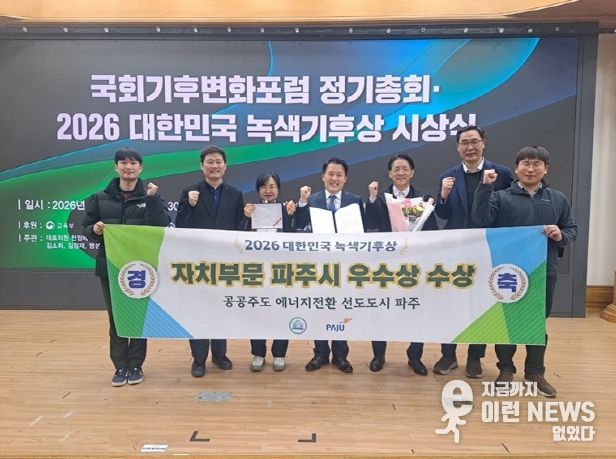 이런뉴스(e-runnews) 김삼성 기자 | 파주시는 2월 25일 여의도 국회 국회의원회관에서 열린 ‘2026 대한민국 녹색기후상’ 시상식에서 자치부문 우수상을 수상했다.