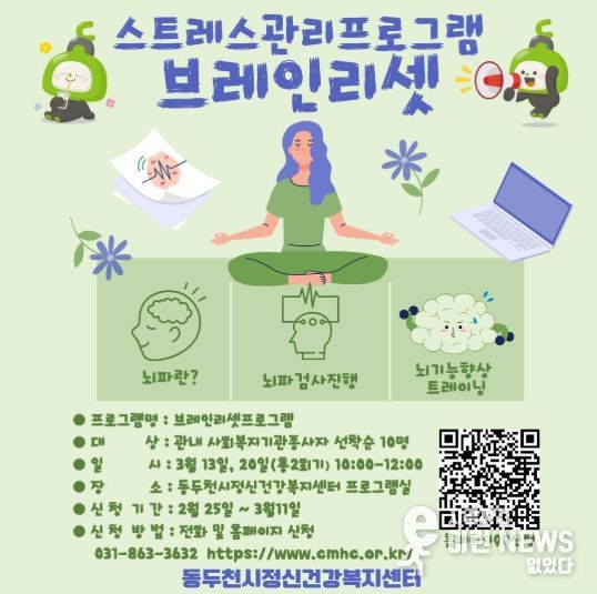 이런뉴스(e-runnews) 김삼성 기자 | 동두천시정신건강복지센터는 오는 3월 13일과 3월 20일, 총 2회에 걸쳐 관내 사회복지기관 종사자를 대상으로 스트레스 관리 교육 ‘브레인리셋’을 운영하며 참여자를 모집한다고 밝혔다.