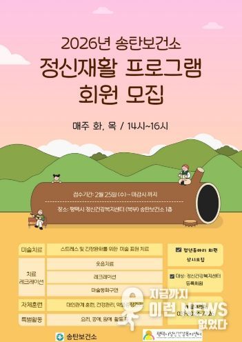 이런뉴스(e-runnews) 김삼성 기자 | 평택시 정신건강복지센터(송탄보건소)는 만 19세 이상 등록회원을 대상으로 ‘2026년 정신재활 프로그램’을 운영한다고 밝혔다. 이번 프로그램은 정신질환자의 사회적응 능력을 키우고 정신건강 증진을 도모하기 위해 마련됐다.