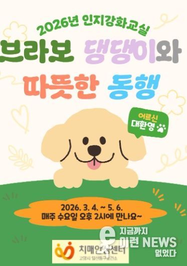 이런뉴스(e-runnews) 김삼성 기자 | 고양특례시 일산동구보건소 치매안심센터는 중앙치매센터에서 개발한 ‘BRABO’ 인지훈련 프로그램과 동물교감치료를 적용한 ‘브라보 댕댕이와 따뜻한 동행’ 프로그램의 참가자를 모집한다고 26일 밝혔다.