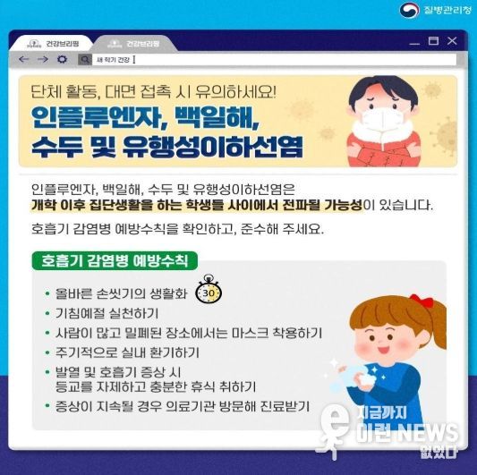 이런뉴스(e-runnews) 김삼성 기자 | 고양특례시 일산서구보건소는 새학기를 맞아 학교·학원 등 집단생활이 본격화되면서 인플루엔자, 백일해, 수두 및 유행성 이하선염 등 유행성 감염병 발생 위험이 높아질 수 있다며 각별한 주의를 당부했다.