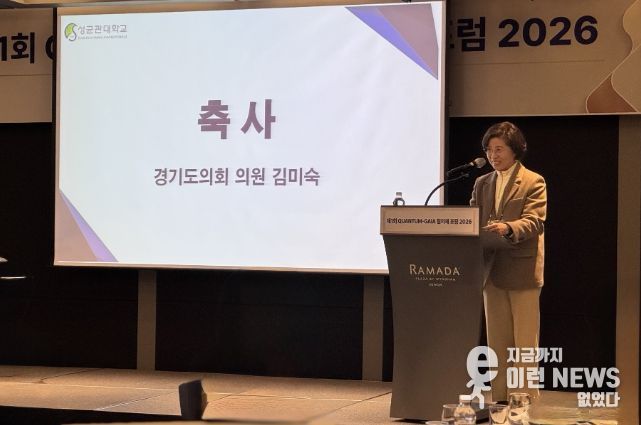 이런뉴스(e-runnews) 김삼성 기자 | 경기도의회 미래과학협력위원회 김미숙 의원(더불어민주당, 군포3)은 26일 수원 라마다프라자호텔에서 열린 ‘제1회 QUANTUM-GAIA 협의체 포럼 2026’에 참석해 축사를 전하고, 양자산업 생태계 조성을 위한 협력 필요성을 강조했다.