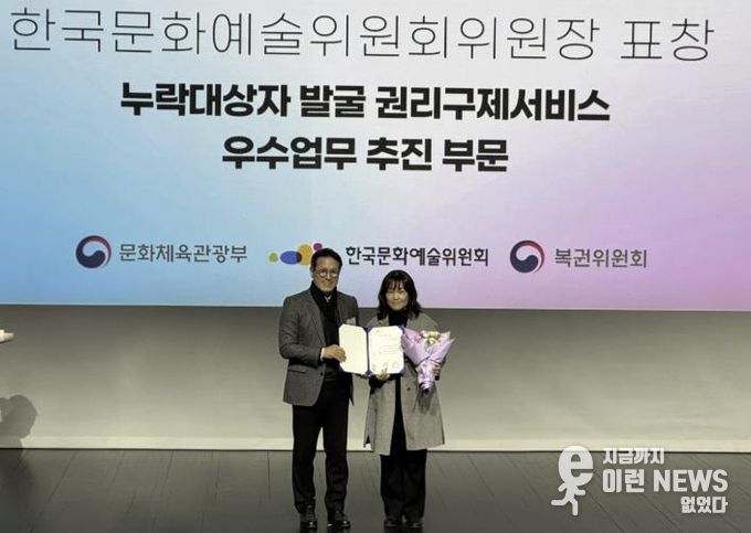 이런뉴스(e-runnews) 김삼성 기자 | 군포시 수리동이 전국 3천6백여개 읍면동을 대상으로 한 “2025년 통합문화이용권(문화누리카드) 누락대상자 권리구제 서비스” 부문 우수기관으로 선정됐다. 이에 따라 지난 2월 26일 모두예술극장(서울 서대문구 충정로 7)에서 열린 시상식에서 한국문화예술위원회 위원장상을 수상했다.