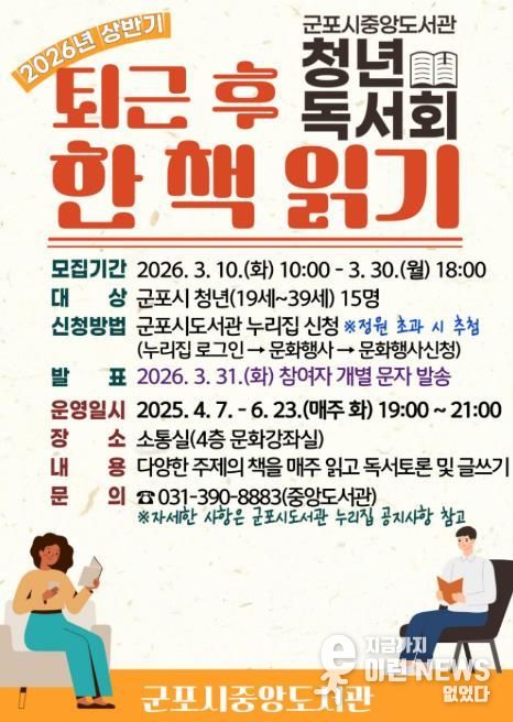이런뉴스(e-runnews) 김삼성 기자 | 군포시중앙도서관은 군포시 청년들의 인문교양 증진과 독서문화 활성화를 위해 2026년 4월부터 상반기 청년독서회 '퇴근 후 한 책 읽기 : 소설을 읽다, 사람을 읽다'를 운영한다.