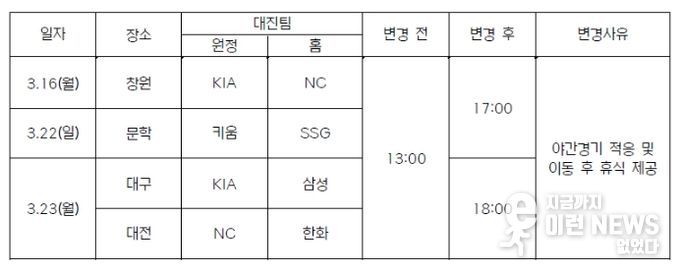 이런뉴스(e-runnews) 김삼성 기자 | 2026 KBO 시범경기 중 일부 경기의 개시 시간이 야간경기 적응 및 이동 후 휴식 제공을 위해 변경됐다.