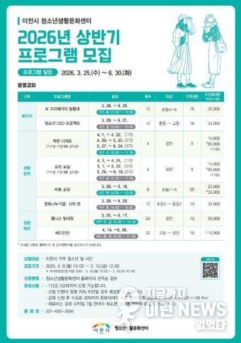 이런뉴스(e-runnews) 김삼성 기자 | 이천시 청소년생활문화센터가 청소년과 지역주민의 건강한 생활문화 형성과 역량 강화를 위해 ‘2026년 상반기 프로그램’을 운영하고 수강생을 모집한다고 밝혔다.