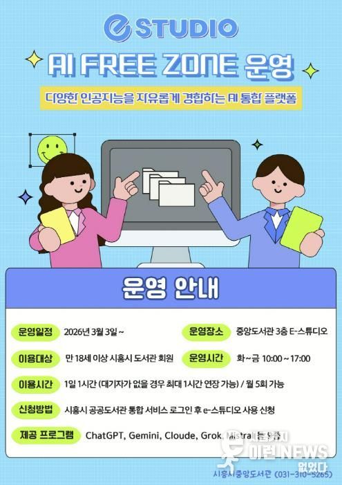 이런뉴스(e-runnews) 김삼성 기자 | 시흥시중앙도서관은 시민들의 인공지능(AI) 활용 역량 강화를 위해 시 정보통신과와 협업해 도서관 3층 e-스튜디오에 ‘인공지능(AI) 프리 존(Free Zone)’을 구축하고, 오는 3월 3일부터 본격 운영에 들어간다.