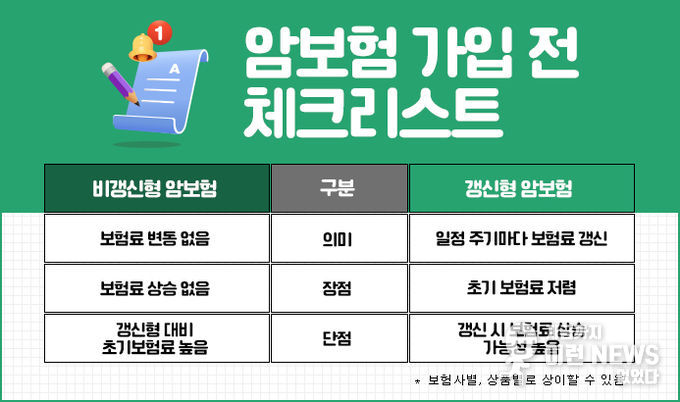 보험료 부담을 줄이려다 보면 저렴한 암보험을 찾게 마련인데 이때 암보험이 갱신형인지 비갱신형인지도 확인할 필요가 있다. 갱신형 암보험은 처음 납입하는 보험료가 저렴하게 느껴지지만 갱신을 할수록 보험료가 계속 높아질 수 있다. 반면 비갱신형은 초기 보험료는 갱신형보다 비싸게 느껴질 수 있지만 앞으로 오르지 않는다는 장점이 있으므로 갱신형 보험보다는 유지 면에서 유리하다. 개인의 소득과 생활패턴, 연령이 다르므로 암보험 갱신형과 비갱신형 중 선택을 하기 전 이러한 차이를 잘 알아두고 본인에게 가장 적합한 것을 고르는 것이 좋다.