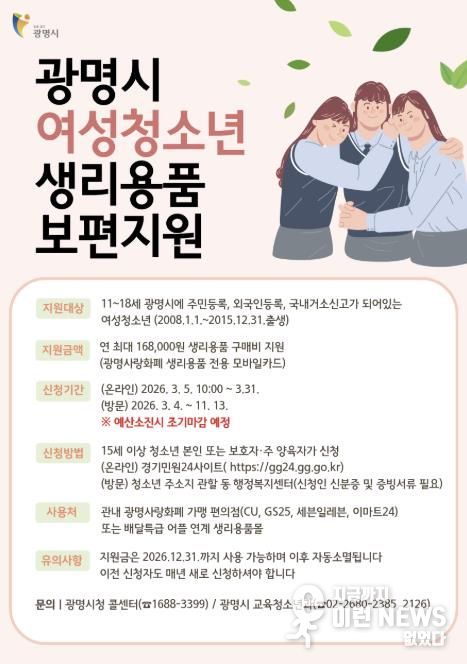 이런뉴스(e-runnews) 김삼성 기자 | 광명시가 4일부터 청소년의 건강권과 인권 보장을 위해 ‘여성청소년 생리용품 보편지원 사업’ 신청을 받는다.
