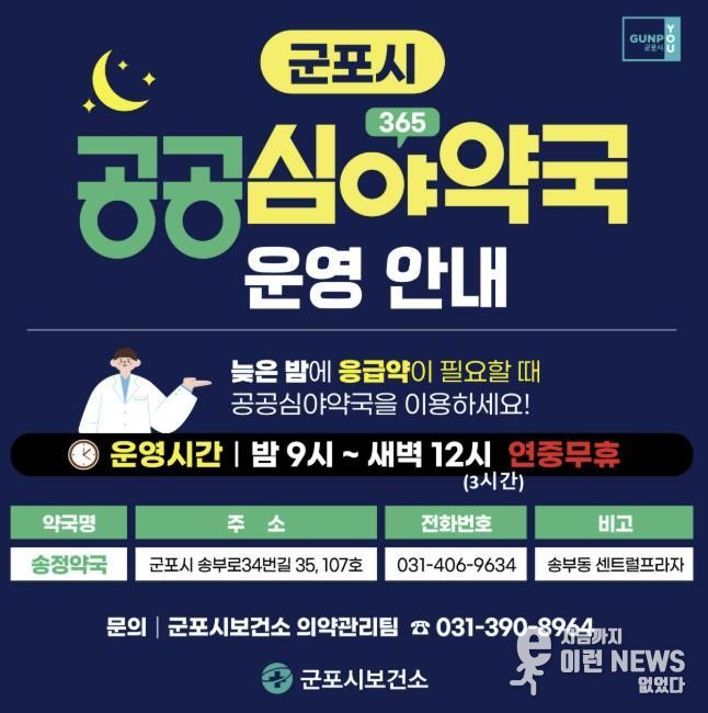 이런뉴스(e-runnews) 김삼성 기자 | 군포시가 오는 3월부터 심야 시간 시민들의 의약품 구매 불편을 해소하고 안전한 투약 환경을 조성하기 위해 연중무휴 ‘공공심야약국’을 신규 지정·운영한다고 밝혔다.