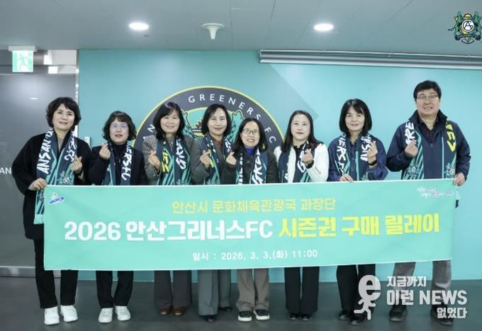 이런뉴스(e-runnews) 김삼성 기자 | 안산시는 지난 3일 문화체육관광국 과장단이 안산그리너스FC(구단주 이민근) 2026시즌 시즌권 구매 릴레이에 동참하며 시민구단 응원 분위기 확산에 힘을 보탰다고 4일 밝혔다.