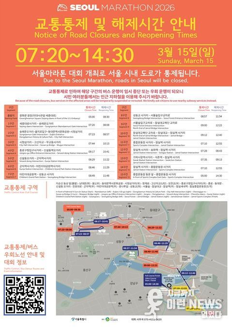 대회 당일인 3월 15일 오전 5시부터 오후 2시 30분까지 광화문광장~잠실종합운동장에 이르는 주요 구간은 단계별로 교통 통제되며 참가자 통과 이후 통제를 즉시 해제, 탄력적이면서도 효율적으로 운영할 방침이다.