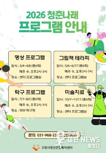 이런뉴스(e-runnews) 김삼성 기자 | 고양시정신건강복지센터는 4일부터 센터 등록 청년을 대상으로 대인관계 회복과 일상 복귀를 돕는 ‘청춘나래 집단프로그램’을 운영한다고 밝혔다.