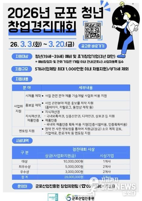 이런뉴스(e-runnews) 김삼성 기자 | 군포산업진흥원은 지역 내 유망 청년 창업가를 발굴하고 혁신 아이디어의 성공적인 사업화를 지원하기 위해 2026년 군포 청년 창업경진대회 지원사업 참가자를 2026년 3월 3일부터 3월 20일까지 모집한다고 밝혔다.