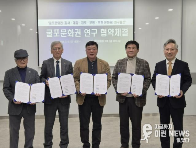 이런뉴스(e-runnews) 김삼성 기자 | 부천문화원과 강서문화원, 계양문화원, 김포문화원, 부평문화원은 3월 4일 부천문화원에서 ‘굴포문화권’을 토대로 하는 연구교류 협약식을 체결했다. 이로써 ‘굴포’를 같은 문화권으로 하는 부천문화원·강서문화원·계양문화원·김포문화원·부평문화원은 학술대회와 콘텐츠 발굴 사업 등 다양한 지역학 자원을 발굴하고 활성화하기 위해 최초로 지역학 연구 모델을 구축하게 됐다. 특히, 이번 협약은 경기도(부천, 김포), 서울특별시(강서), 인천광역시(계양, 부평)를 잇는 ‘지역학’중심의 연구 교류를 마련한다는 점에서 주목된다.