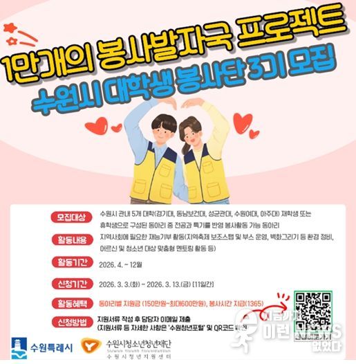 이런뉴스(e-runnews) 김삼성 기자 | 수원시청소년청년재단 수원시청년지원센터는 3월 3일부터 3월 13일까지 지역사회 봉사 문화를 확산하고 대학생들의 사회공헌 활동을 지원하기 위한 '1만 개의 봉사발자국' 참여 동아리를 모집한다.