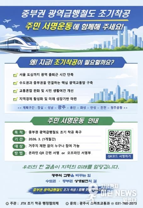 이런뉴스(e-runnews) 김삼성 기자 | 광주시는 중부권 광역급행철도의 조기 착공을 촉구하기 위해 3월 한 달간 주민 서명운동을 한다고 6일 밝혔다.