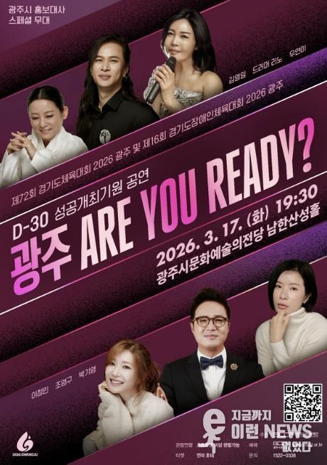 이런뉴스(e-runnews) 김삼성 기자 | 광주시문화재단은 오는 17일 ‘제72회 경기도체육대회 및 제16회 경기도장애인체육대회 2026 광주’의 성공 개최를 기원하고 대회 개막 30일 전을 기념하는 ‘광주 ARE YOU READY?’ 공연을 개최한다고 6일 밝혔다.