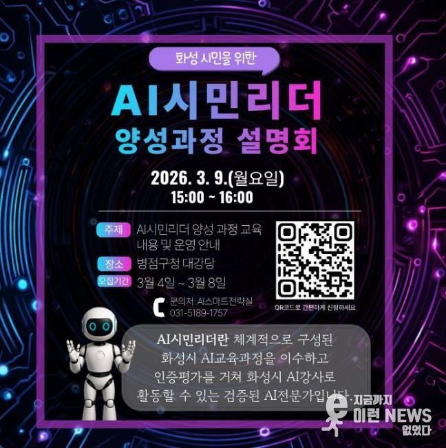 이런뉴스(e-runnews) 김삼성 기자 | 화성특례시는 시민이 학습하고 교육하는 인공지능(AI) 학습 체계 구축을 위해 ‘2026년 AI시민리더 양성 교육’ 설명회를 3월 9일 오후 3시에 병점구청 대강당에서 개최한다.