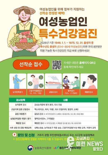 검진은 수원시 권선구에 위치한 수원덕산병원에서 진행되며, 근골격계 질환, 심혈관계 질환, 골절·낙상 위험, 농약 노출 관련 검사, 폐기능 검사 등 농작업 환경과 관련된 건강검진 항목으로 구성됐다. 또한 전문의 상담과 예방교육도 함께 제공된다.