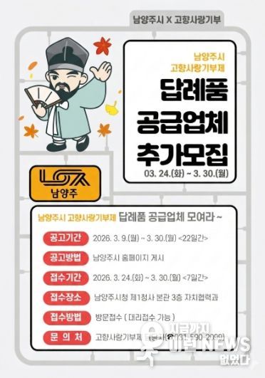 이런뉴스(e-runnews) 김삼성 기자 | 남양주시는 오는 3월 24일부터 고향사랑기부제 참여자들에게 제공할 ‘2026년 고향사랑기부제 답례품 공급업체’ 추가 모집 접수를 시작한다고 6일 밝혔다.