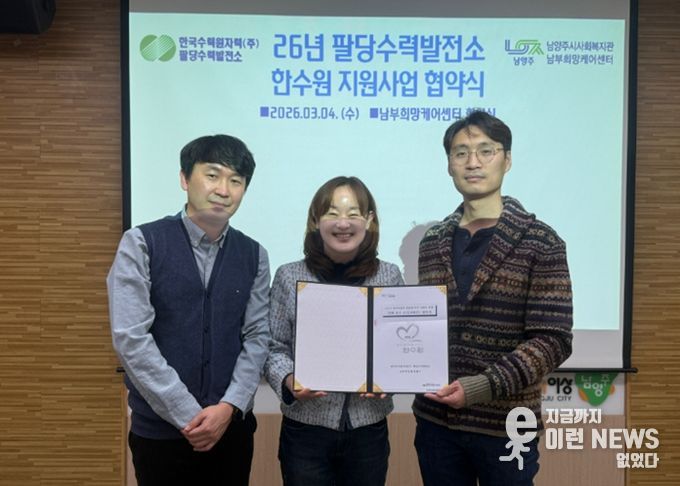 이런뉴스(e-runnews) 김삼성 기자 | 남양주시는 지난 4일 남부희망케어센터가 한수원(주)팔당수력발전소와 ‘함께 살기 조(안)와(부)’지원사업 진행을 위한 협약식을 개최하고 지역사회 복지 증진을 위한 협력체계를 구축했다고 6일 밝혔다.