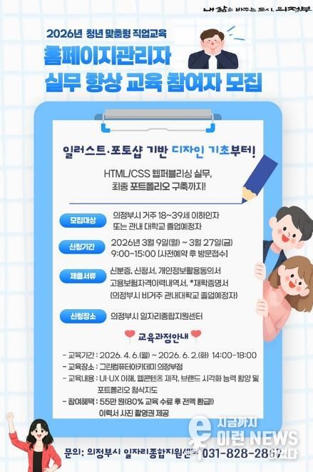 이런뉴스(e-runnews) 김삼성 기자 | 의정부시는 사회에 첫발을 내딛는 청년과 전직 희망자를 위해 4월 6일부터 6월 2일까지 9주간 ‘홈페이지 관리자 실무 향상 교육’을 운영한다.