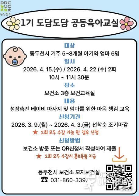 이런뉴스(e-runnews) 김삼성 기자 | 동두천시보건소는 관내 5~8개월 아기와 엄마를 대상으로 상호작용 증진과 양육 역량 강화를 위해“도담도담 공동육아교실”을 운영한다고 밝혔다.