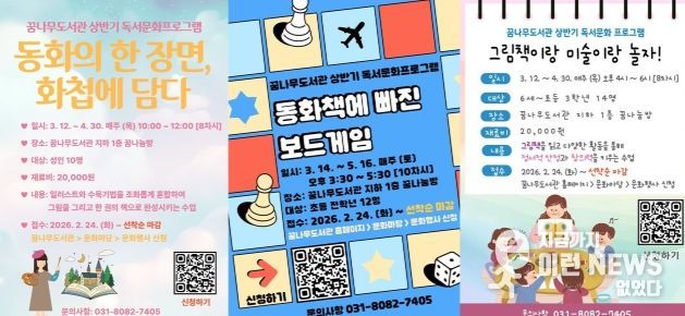 또한 ‘동화책에 빠진 보드게임’ 프로그램은 오는 3월 14일부터 5월 16일까지 매주 토요일 오후 3시 30분부터 5시 30분까지 총 10차시로 운영된다. 동화책을 읽고 이야기를 나눈 뒤 내용과 연계된 보드게임을 배우며 자연스럽게 독서에 대한 흥미를 높일 수 있도록 구성됐다. 대상은 초등학생 전 학년 12명이며 별도의 재료비는 없다.