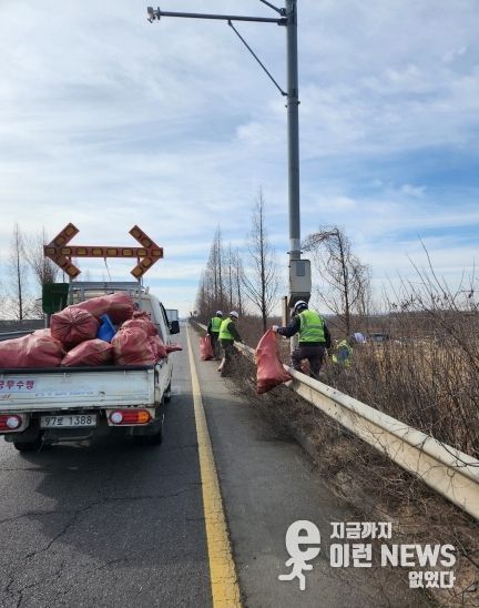시는 지난 2월 26일 시작하여 3월 15일까지 관내 주요 국도 구간을 대상으로 환경 정비를 실시 중이며, 현재 교차로 및 비탈면 등에서 생활 쓰레기와 불법 투기 폐기물 등 1톤 마대 80여 개 분량의 폐기물을 수거하는 등 국도변 청소 작업을 하고 있다.