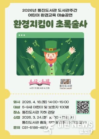 ‘환경지킴이 초록술사’ 공연은 4월 18일 오후 2시부터 3시까지 통진도서관 지하 강당에서 진행된다. 대상은 5~9세 어린이 및 보호자 100명이다. 참여를 원할 경우 3월 24일 오전 10시부터 통진도서관 누리집에서 신청하면 된다.