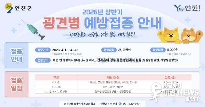 이런뉴스(e-runnews) 김삼성 기자 | 연천군은 오는 4월 1일부터 4월 30일까지 ‘2026년 상반기 광견병 예방접종’을 일제히 실시한다고 밝혔다. 실시 대상은 연천군 관내 가정에서 사육하는 개, 고양이 등 광견병 전염 우려가 있는 동물이다.