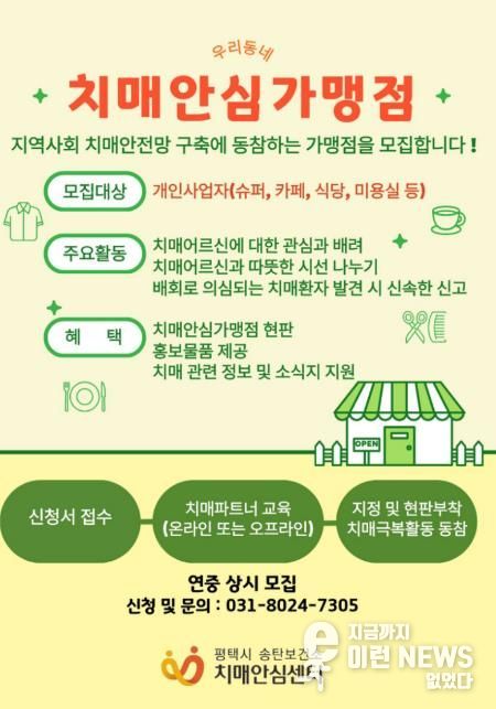 이런뉴스(e-runnews) 김삼성 기자 | 평택시 송탄치매안심센터는 지역사회 내 치매 친화적 환경 조성과 촘촘한 치매 안전망 구축을 위해 ‘치매안심가맹점’을 신규 모집한다고 밝혔다.