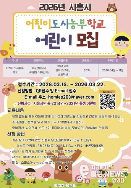 이런뉴스(e-runnews) 김삼성 기자 | 시흥시는 어린이들에게 생명농업 자원을 활용한 자연친화적 농업 체험 기회를 제공해 유년기 건강한 성장을 돕기 위한 ‘2026년 어린이 도시농부학교’를 4월부터 11월까지 배곧텃밭나라에서 운영한다.