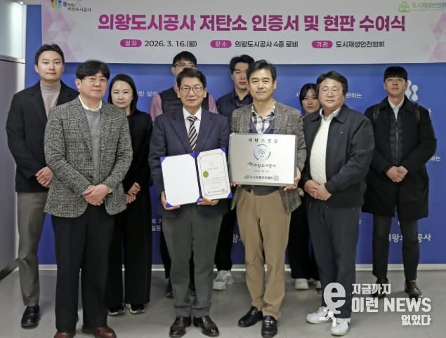 이런뉴스(e-runnews) 김삼성 기자 | 의왕도시공사가 3월 16일 도시재생안전협회가 주관하는‘저탄소 인증’을 획득하고 인증서 및 현판 수여식을 개최했다.