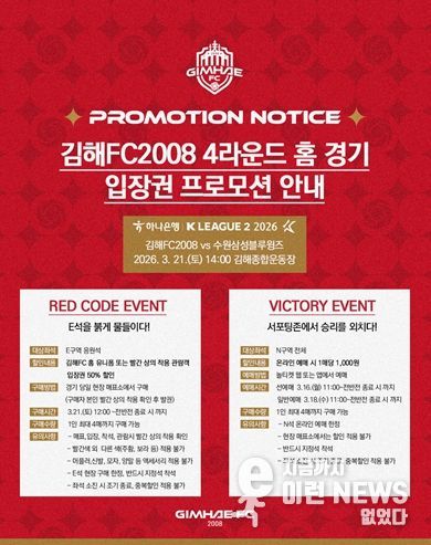 이런뉴스(e-runnews) 김삼성 기자 | 김해FC2008이 오는 21일 오후 2시 김해종합운동장에서 열리는 수원삼성블루윙즈와의 ‘하나은행 K리그2 2026’ 4라운드 홈 경기를 앞두고, 첫 승을 기원하는 대대적인 할인 프로모션을 진행한다고 밝혔다.
