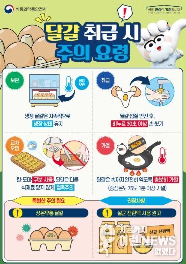 주요 내용은 ▲냉장 달걀의 지속적인 냉장 상태 유지 ▲달걀껍질을 만진 후 30초 이상 비누로 손 씻기 ▲칼·도마 구분 사용으로 교차오염 방지 ▲중심온도 75도에서 1분 이상 충분히 가열하기 등이다.
