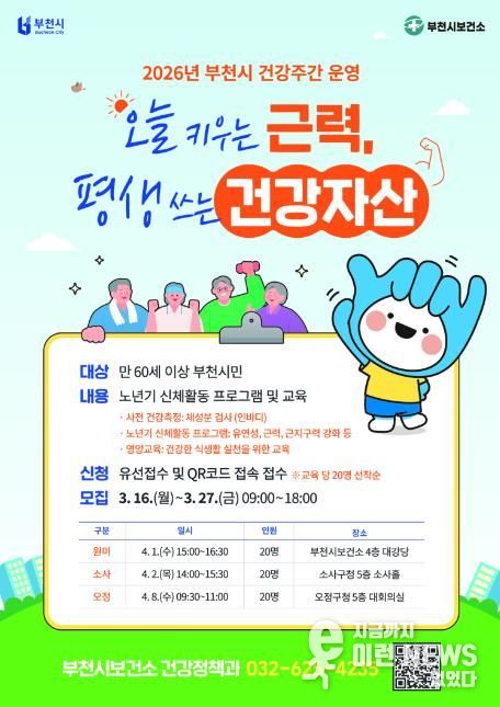 이런뉴스(e-runnews) 김삼성 기자 | 부천시는 4월 1일부터 4월 8일까지 ‘건강주간’으로 지정하고 지역 주민의 건강한 노년 생활을 지원하기 위해 ‘오늘 키우는 근력, 평생 쓰는 건강자산’ 프로그램을 운영한다.