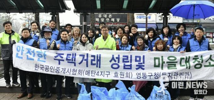 이런뉴스(e-runnews) 김삼성 기자 | 수원시 영통구는 지난 18일, 매탄동 소재 공인중개사 봉사단체 효원회가 영통구청 인근의 주택가와 상가 지역을 중심으로 환경정화 활동을 실시했다고 밝혔다.