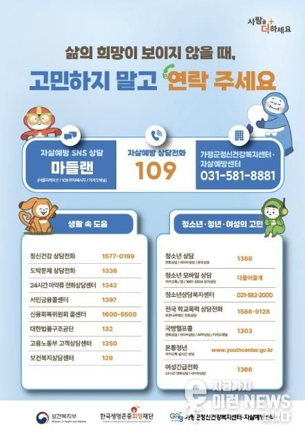 이런뉴스(e-runnews) 김삼성 기자 | 가평군정신건강복지센터와 자살예방센터가 봄철 자살 위험 증가에 대응해 집중 예방 활동에 나섰다.