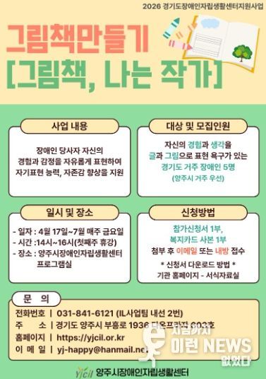 이런뉴스(e-runnews) 김삼성 기자 | 양주시장애인자립생활센터에서는 장애인의 문화·예술 참여 기회를 확대하고 자기 표현의 장을 마련하기 위해 그림책 만들기[그림책, 나는 작가] 참가자를 모집한다.