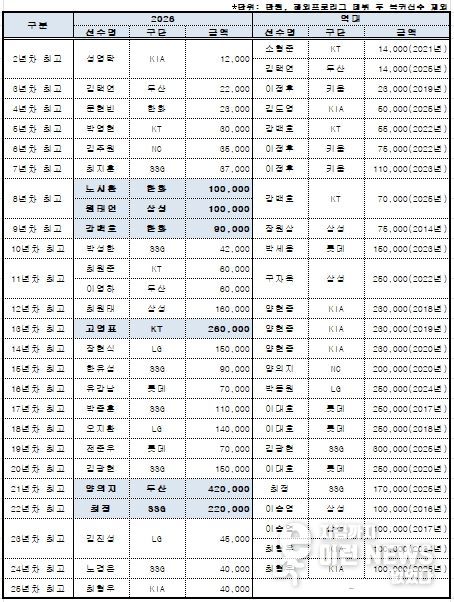 또한 2026시즌부터 시행되는 아시아쿼터 선수들의 연봉도 집계됐다. LG 웰스, SSG 타케다, 두산 타무라가 각각 20만 달러씩 받으며 아시아쿼터 선수 연봉(계약금 포함) 공동 1위에 올랐다.