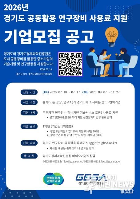 이런뉴스(e-runnews) 김삼성 기자 | 경기도와 경기도경제과학진흥원이 도내 중소·벤처기업의 연구개발(R&D) 경쟁력 강화를 위해 ‘2026년 경기도 공동활용 연구장비 사용료 지원 사업’을 추진한다.